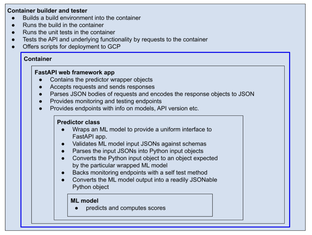 Wrapper class and generic API plus Podman/Docker build automation for Python ML models. A containerized model suitable for local runner, Kubernetes, or a serverless container runner behind a well-thought HTTP API that forces you to second thoughts about monitoring i.e. requires that you provide some model monitoring and automatically builds some more for you, and whose monitoring endpoints are named uniformly, with JSON payloads validated against the schemas you supply and automated build-time testing of the API endpoints before container finalisation.